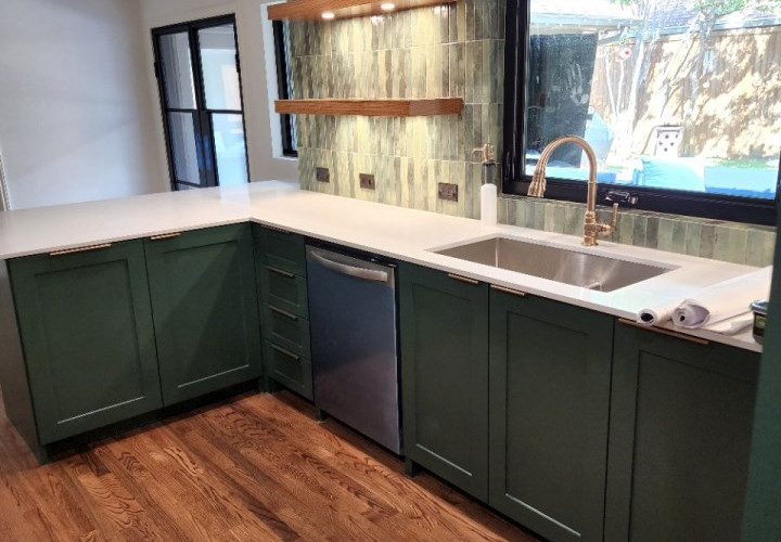 The color palette centers around a striking hunter green for cabinetry, lending the room a sense of calm sophistication. Paired with warm natural light, this deep, earthy tone makes the kitchen feel both bold and welcoming—a space where aesthetics meet comfort.